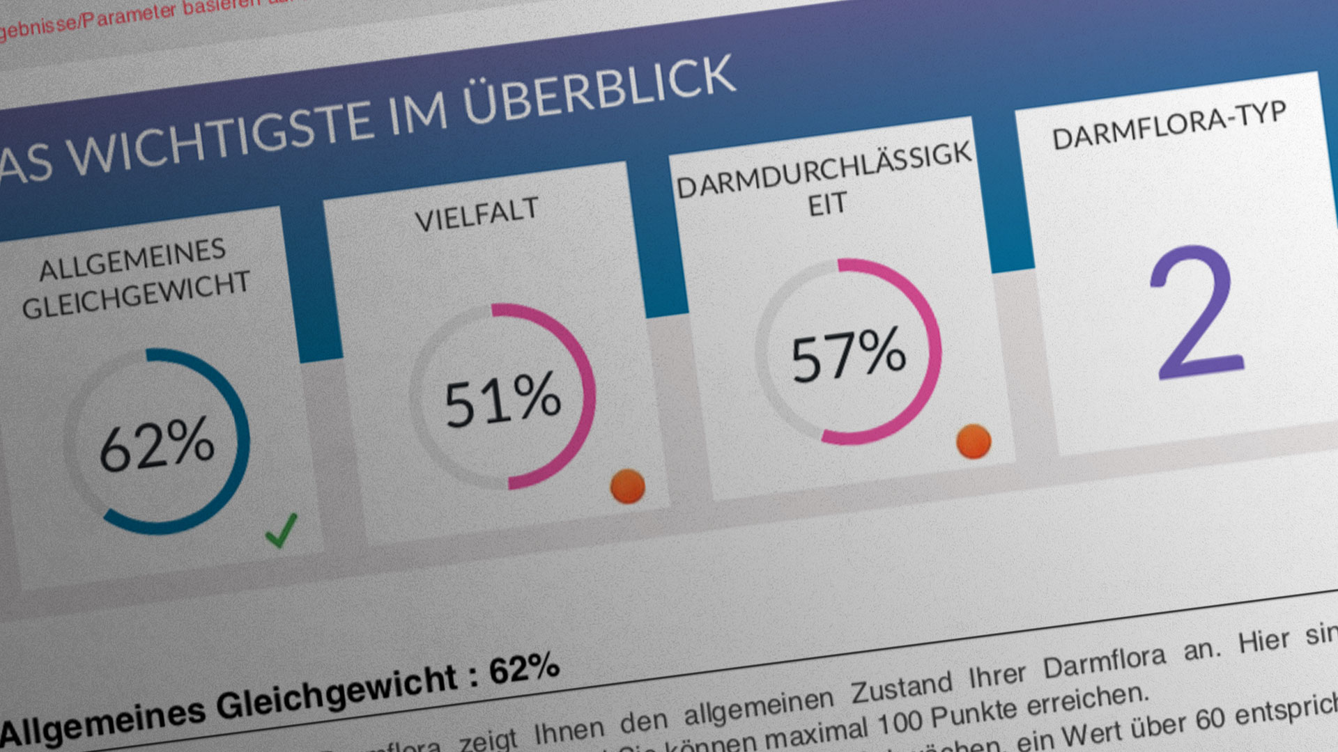 Eine Vielzahl von Darmbakterien, Darmdurchlässigkeit, das Vorhandensein von Dysbiose, Neigung zu Nahrungsmittelunverträglichkeiten, der Zustand des Immunsystems, Neigung zur Gewichtszunahme, Vitaminsynthese, Art der Mikrobiota, Zustand der emotionalen Ausgeglichenheit und Ruhe, ein Indikator für Entzündungen und Verstopfung